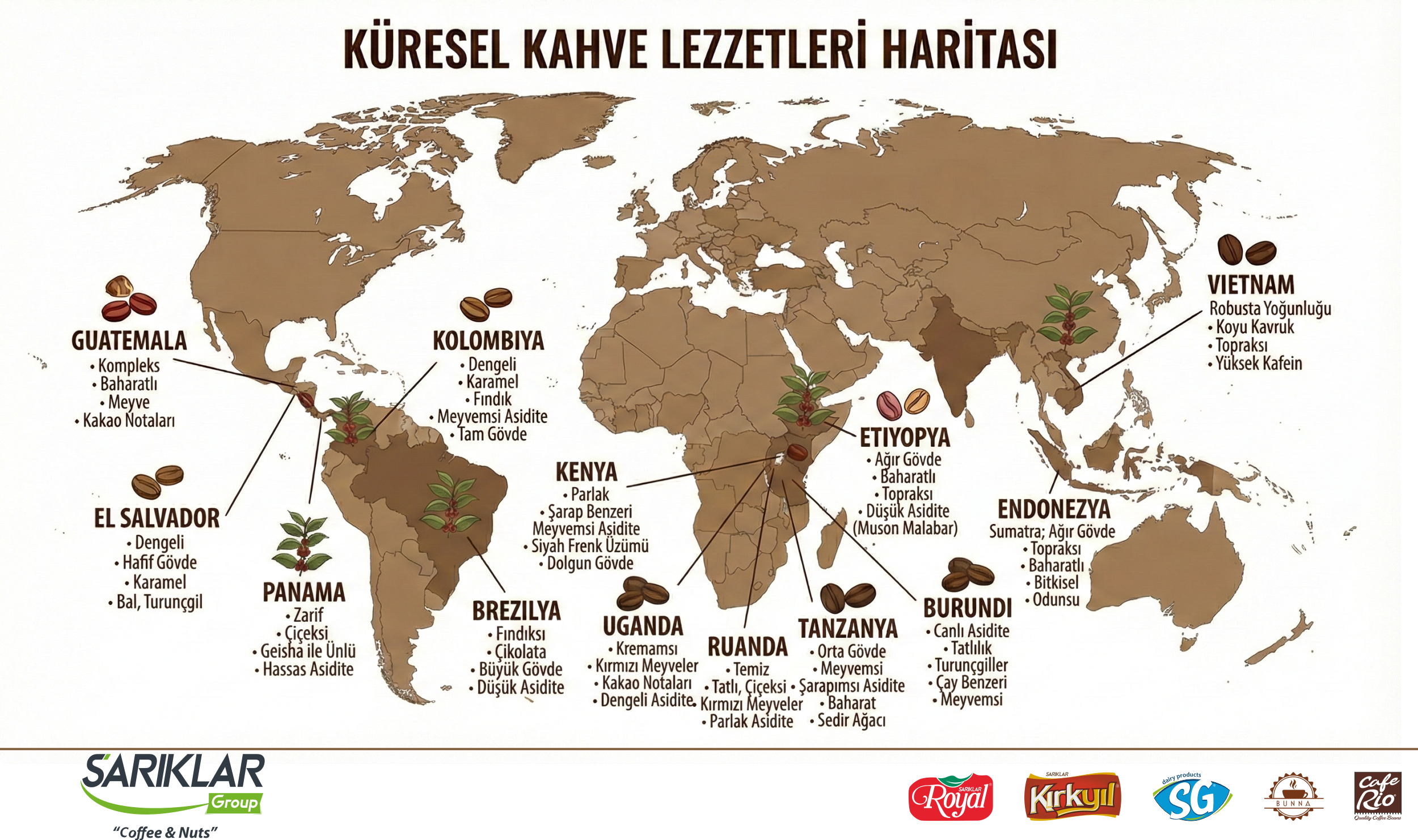 Aşağıda yer alan ülke listesi üzerinden, Sarıklar’ın farklı bölgelerden özenle seçtiği kahve çekirdeklerine ulaşabilirsiniz. İlgilendiğiniz ülkeye tıklayarak her ülkenin kendine özgü kahve çeşitlerini, tat profillerini ve detaylı bilgilerini keşfedebilirsiniz.